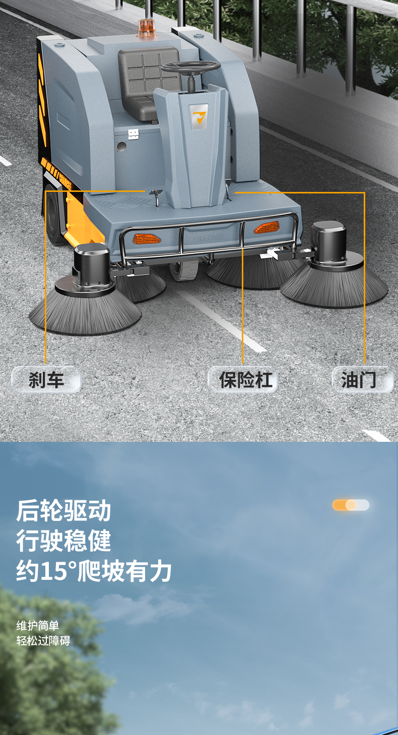 橙犀U190 駕駛式掃地機:1臺約比10人強,是1萬平方米左右場地清潔性價比之選。擁有1萬㎡清潔效率,180L塵集箱,四刷聚塵,邊刷放撞自動復位功能。